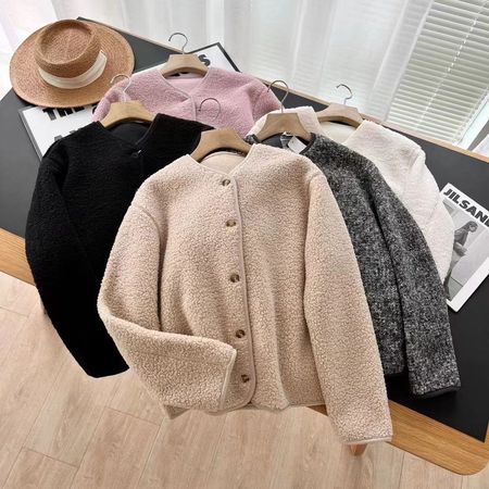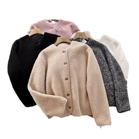 Women Polar Fleece Crew Neck Cardigan Single Breasted Long Sleeve Warm Jacket